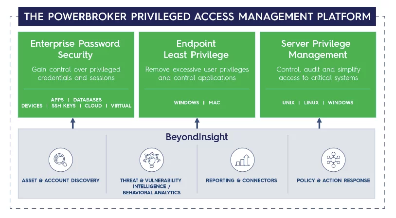 פלטפורמת PowerBroker לניהול גישה מחשבונות רגישים מכילה שלושה רכיבים חזקים, מעל שכבה משותפת (שכבת BeyondInsight) של איתור, ניתוח, דווחים, וטיפול בסיכוני אבטחה: